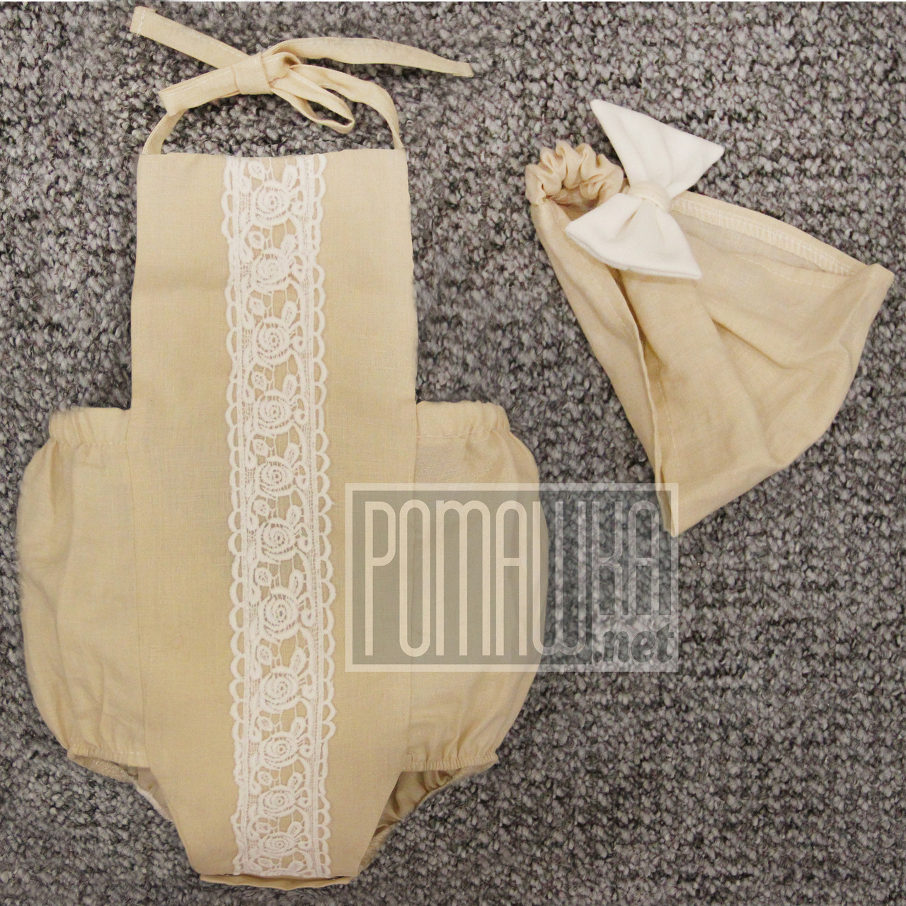 У коплекте: ромпер (боді) на зав'язках і косинка-пов'язка на голову. Бантик на косинці знімний. Знявши бантик у Вас вийде косинка, закріпіть бантик на косинці назад і її можна використовувати як пов'язку.